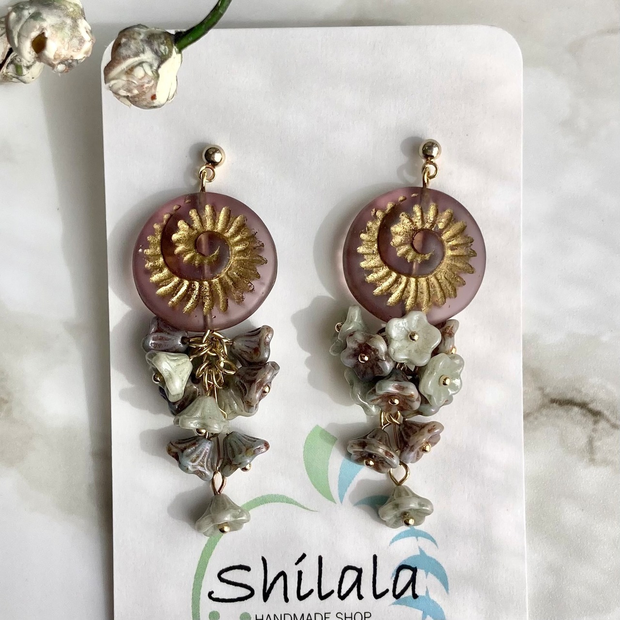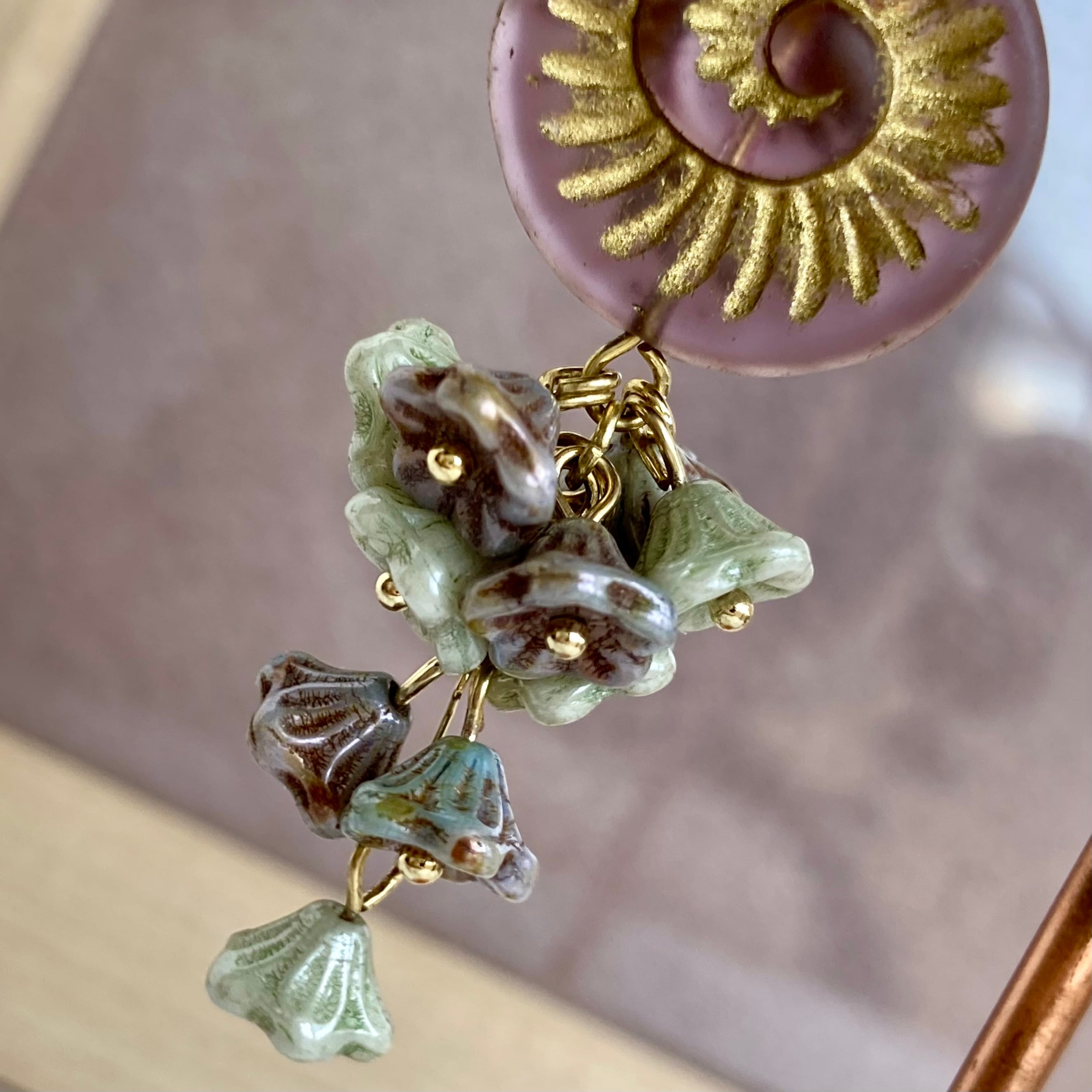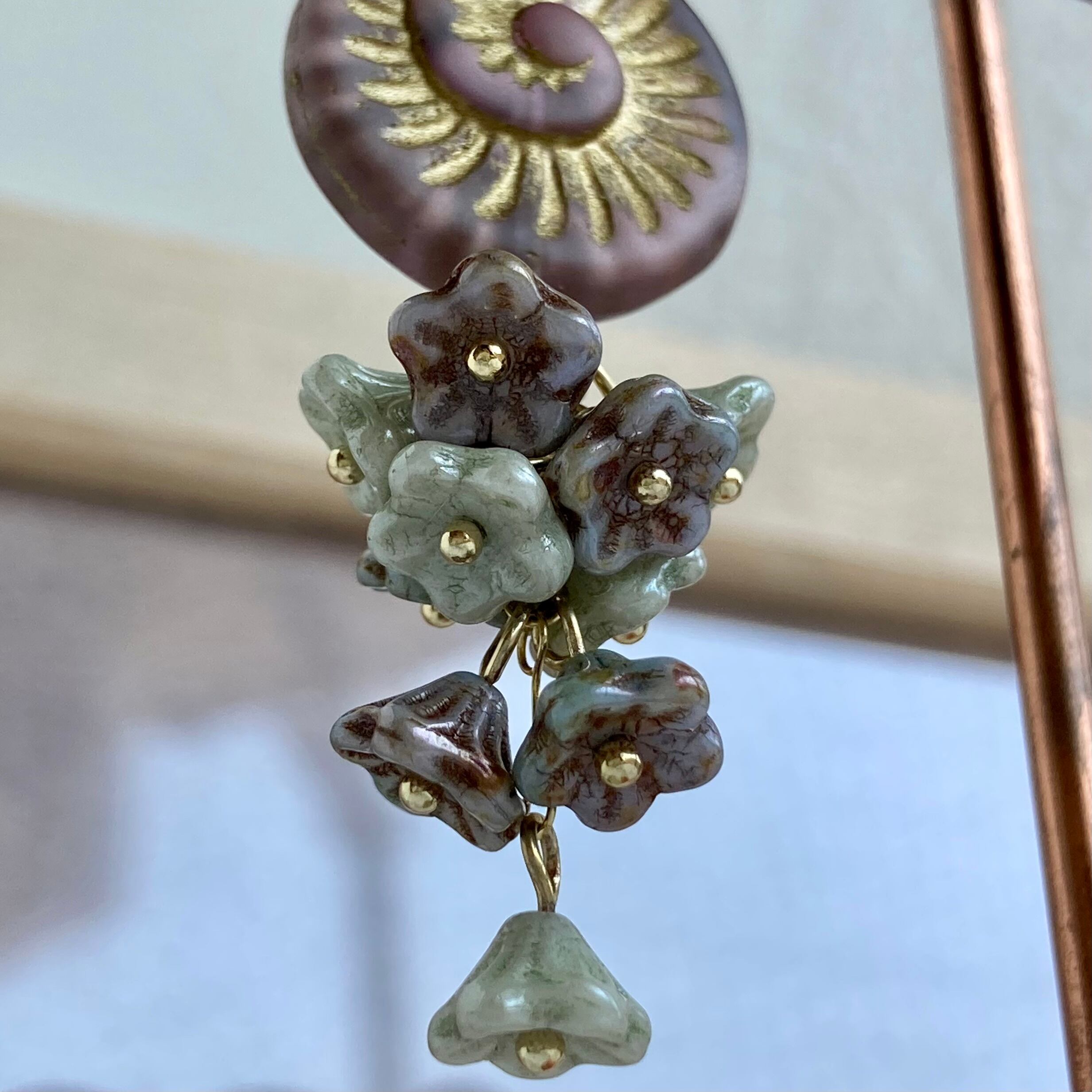 アンモナイト×花×チェコビーズと私の好きなものを詰め込んだ作品です。