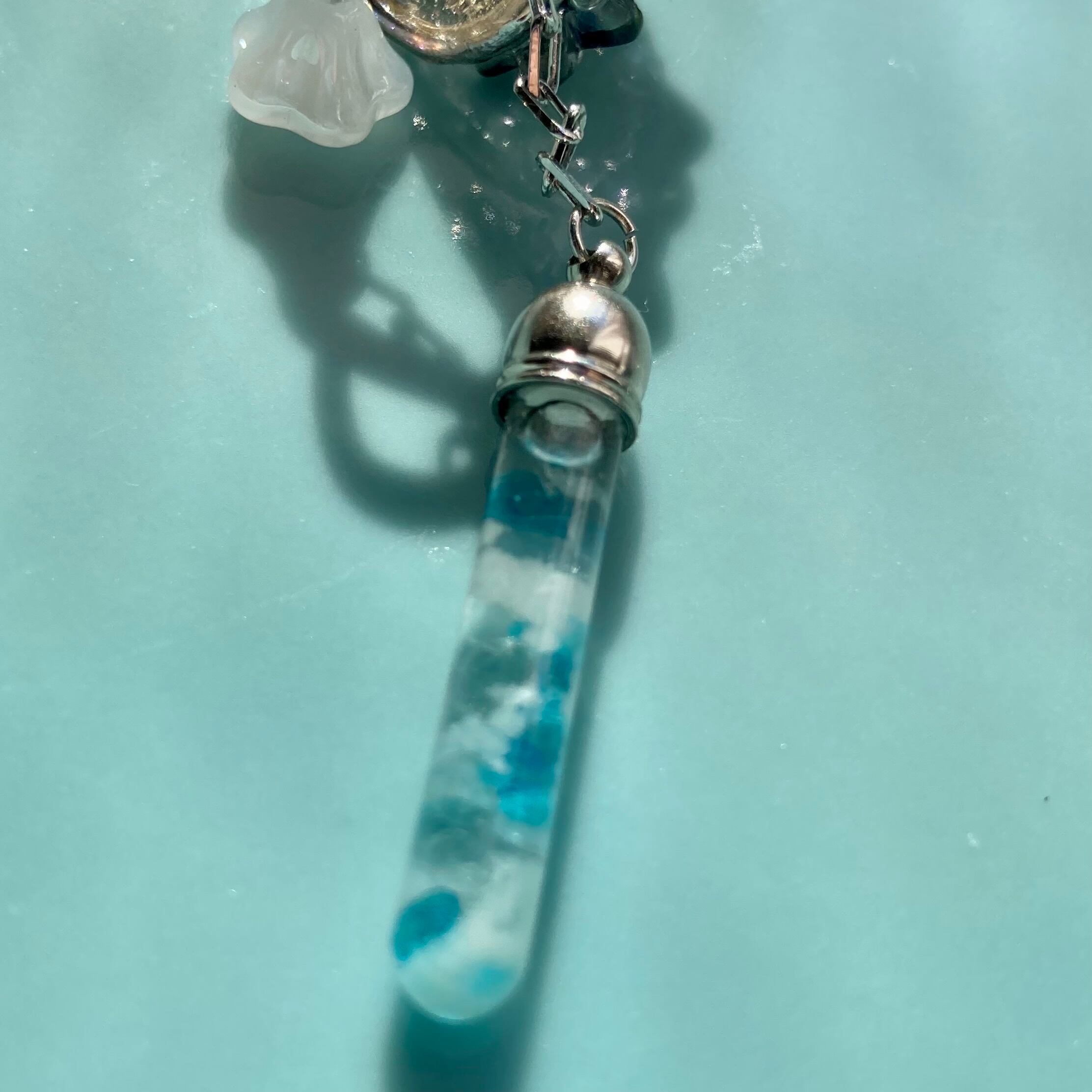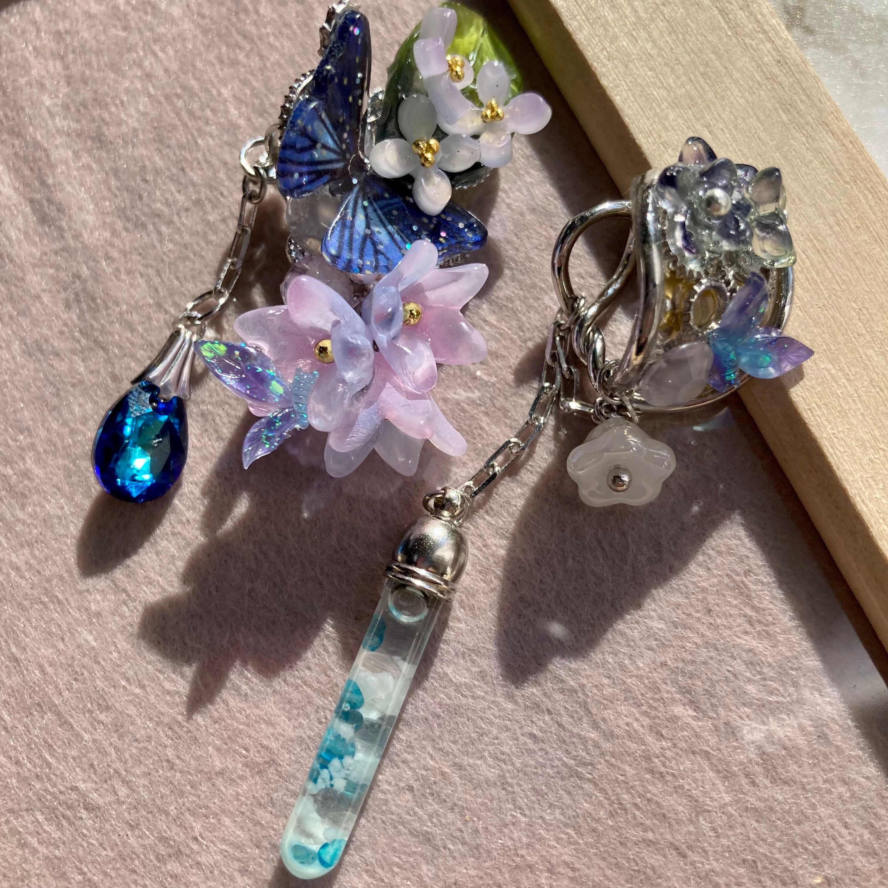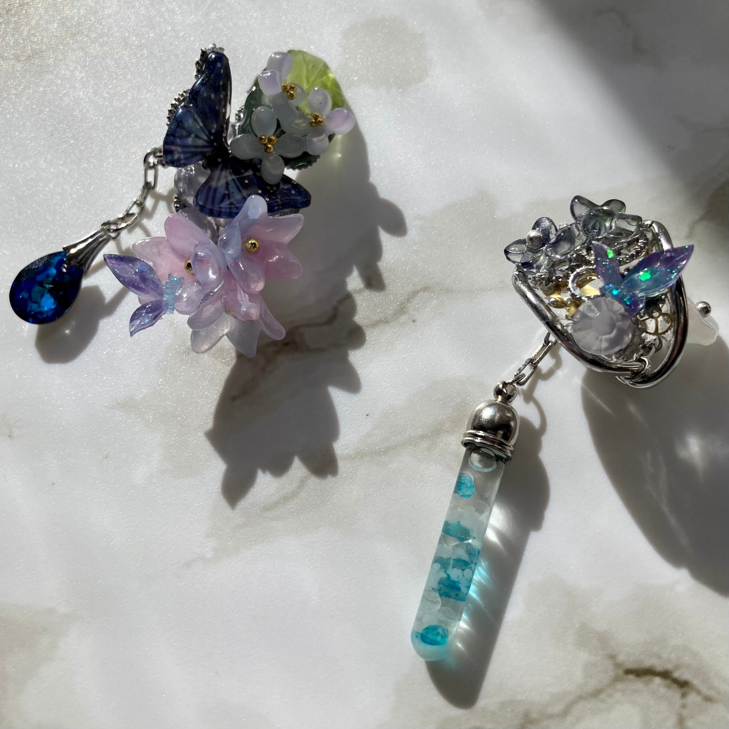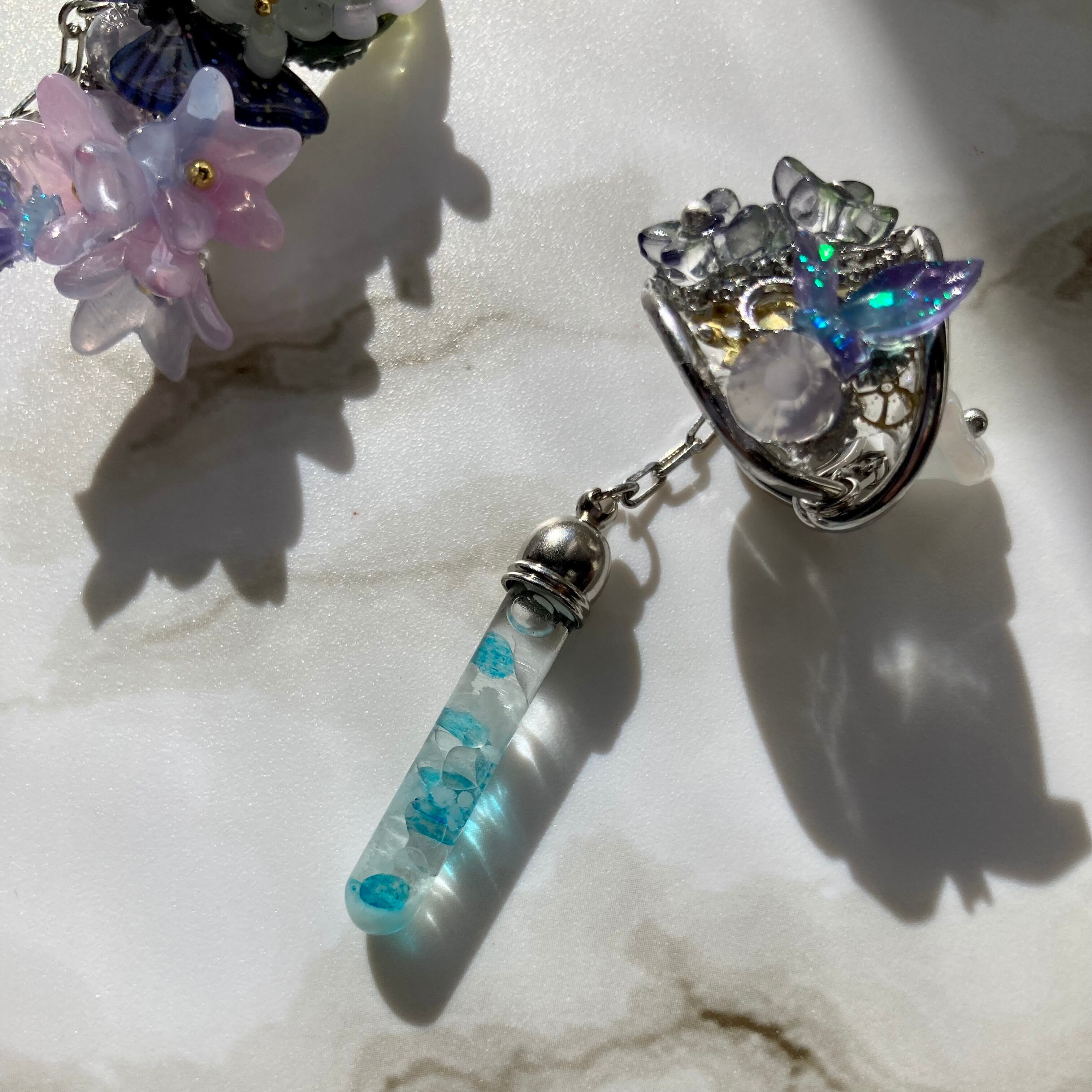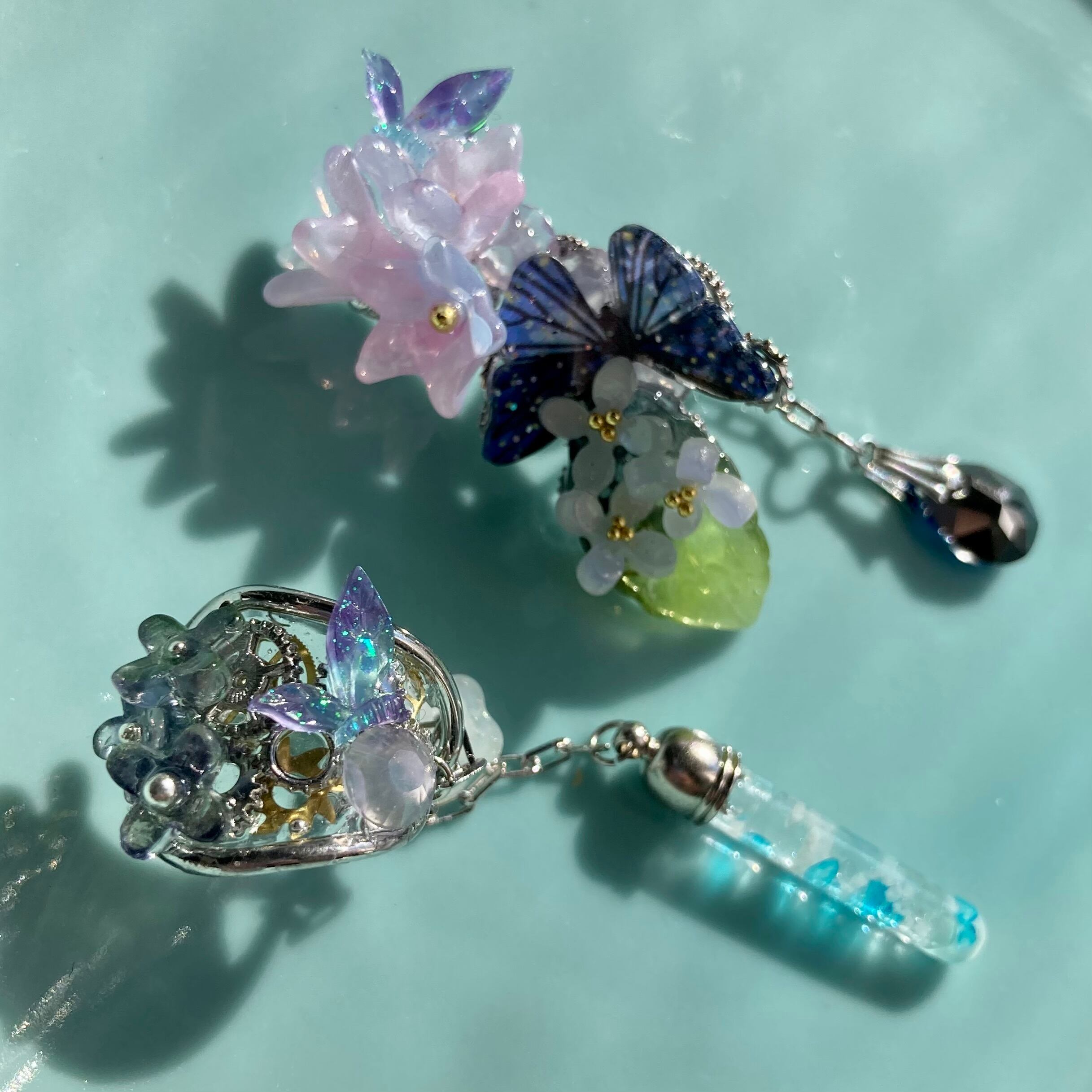 ・ガラス、蓄光パウダー、ガラスビーズ、レジン、ブリオン、金属パーツ